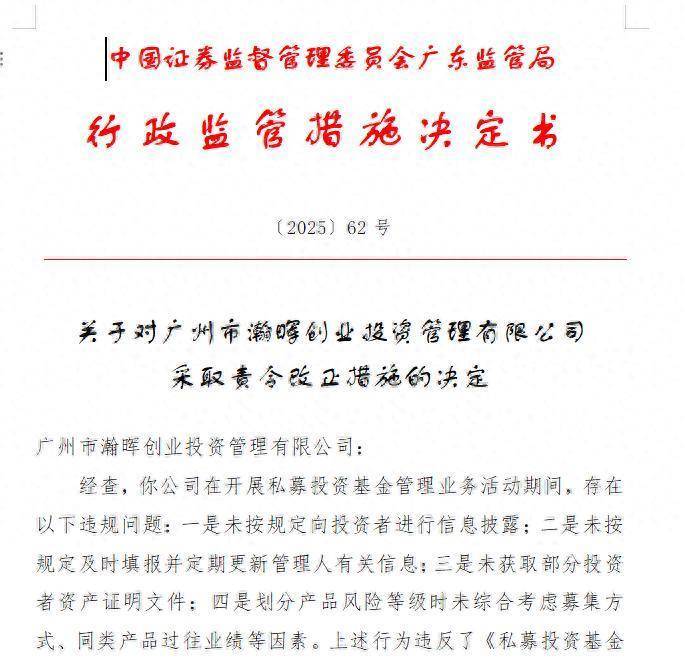 基于上述违规行为,根据《私募办法》第三十三条和《适当性办法》第三十七条的规定,广东证监局决定对瀚晖创投采取责令改正的行政监管措施。